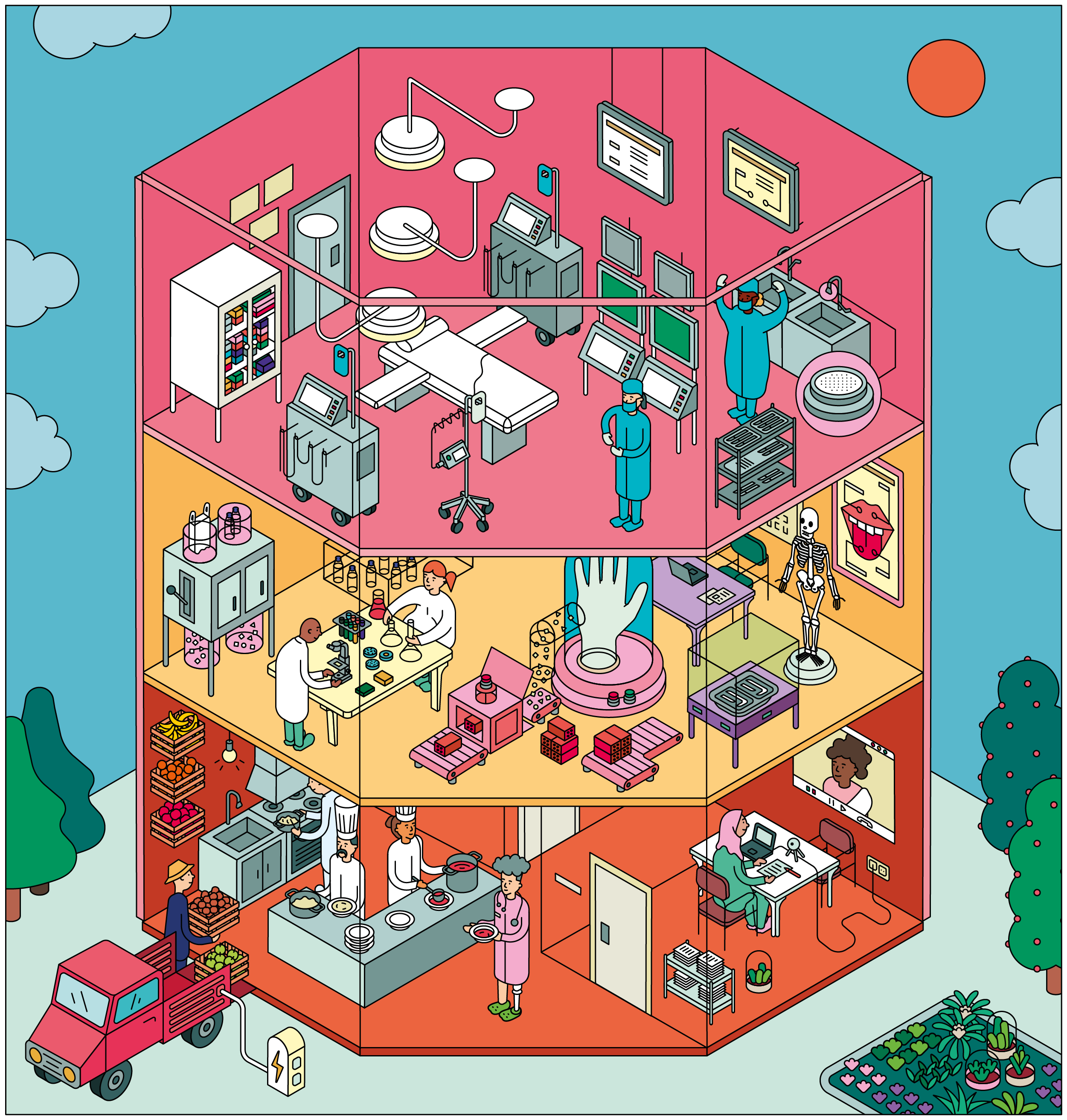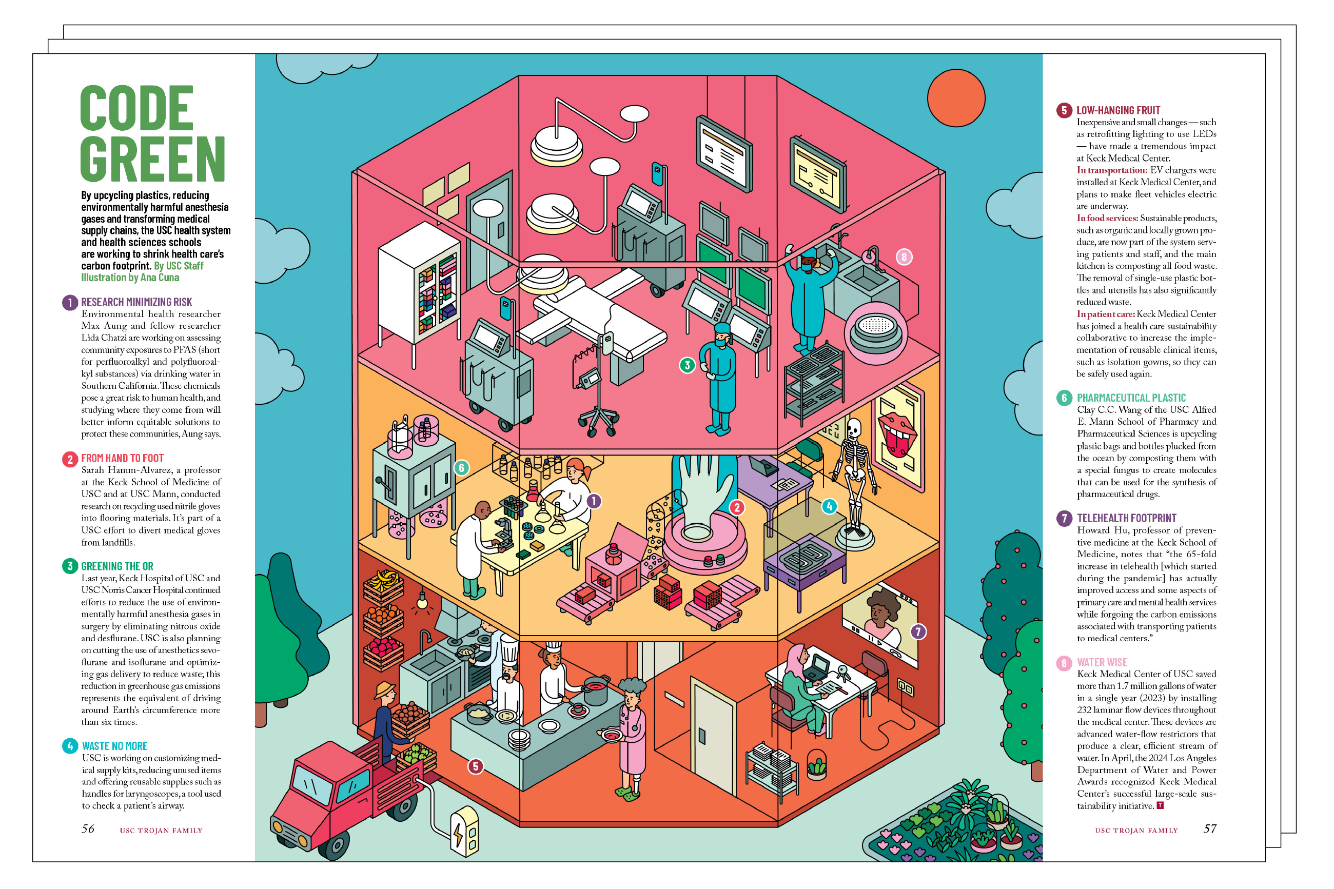 Code Green is a detailed illustration project visualizing the sustainability efforts of the Keck Medical Center of USC and USC Norris Cancer Hospital. Commissioned by Pentagram for Trojan Family Magazine, the project highlights groundbreaking initiatives in environmental responsibility and innovation within the healthcare sector.