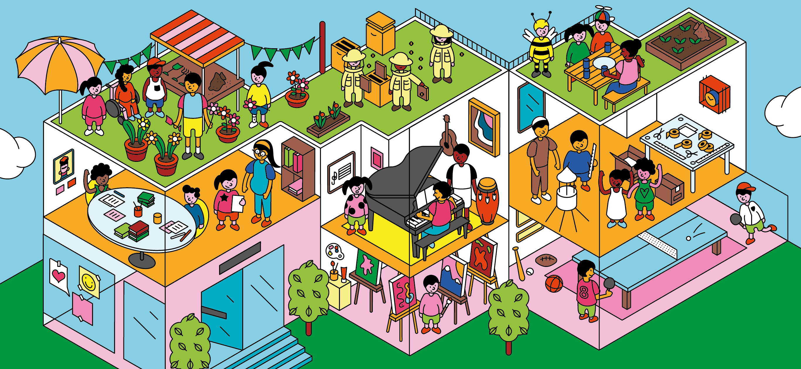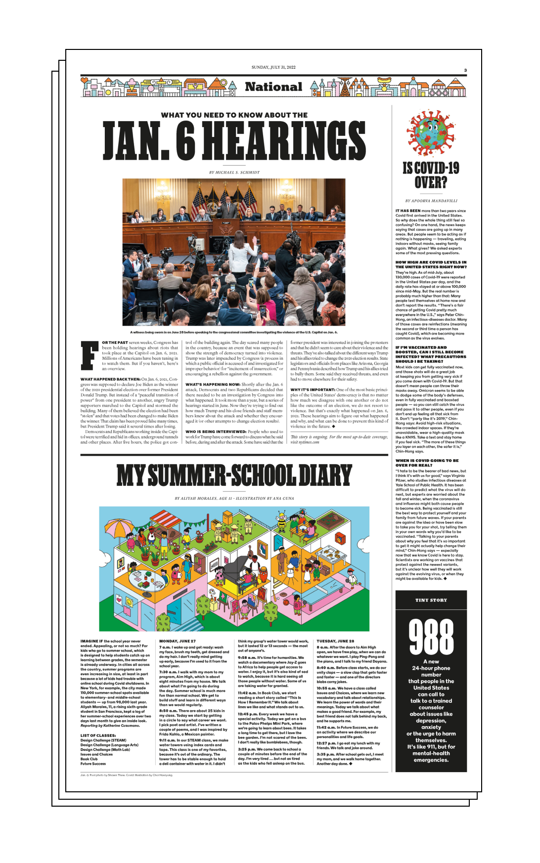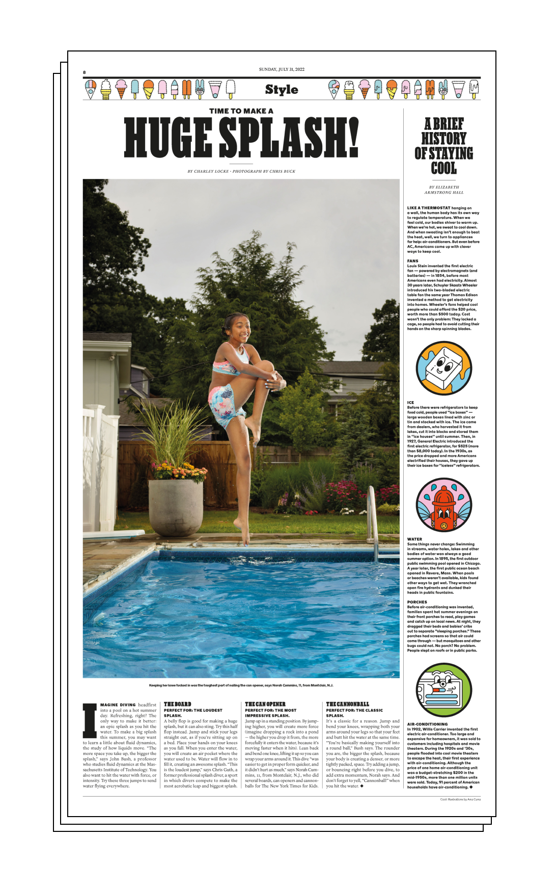 Illustrations for the August issue of New York Times Kids about summer schools in the United States and the methods Americans used in the 1970s to cope with the heat.