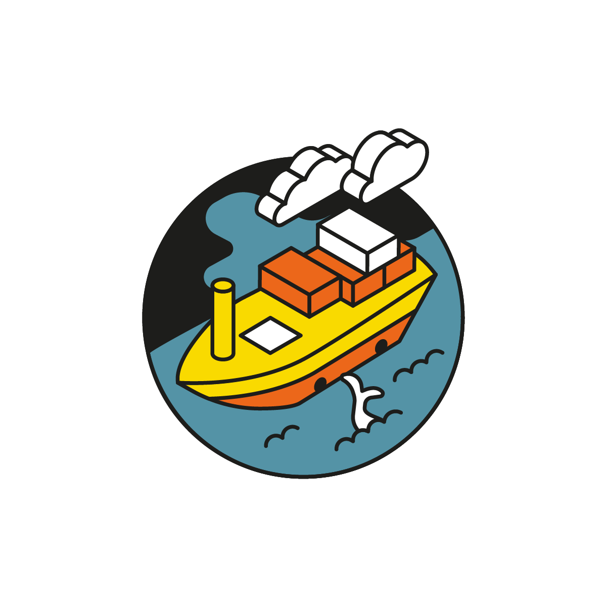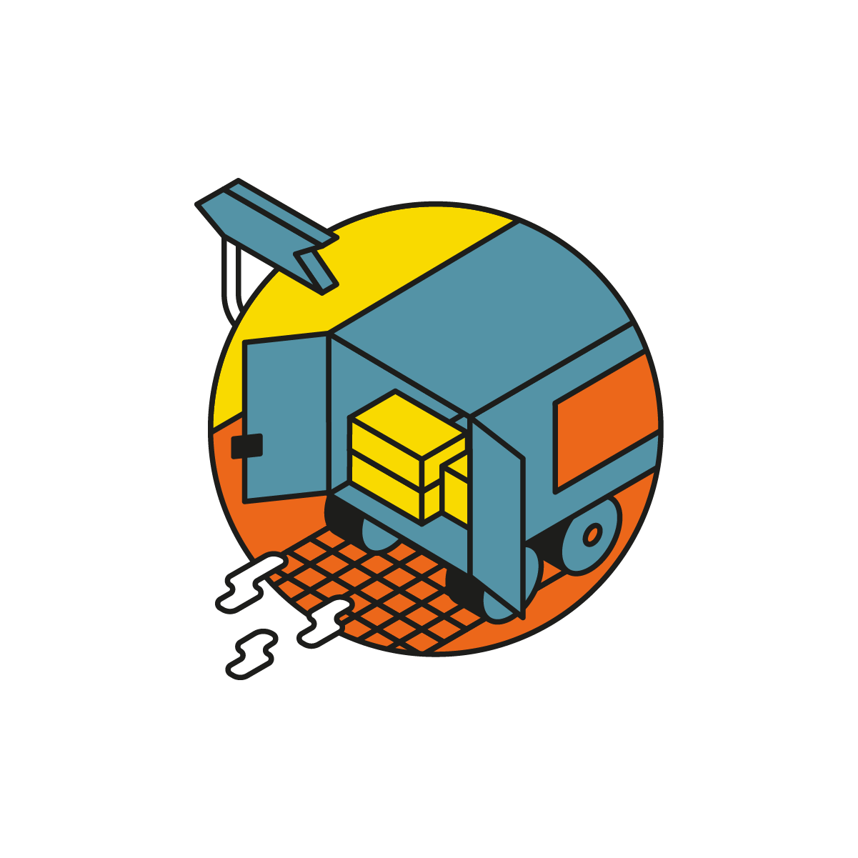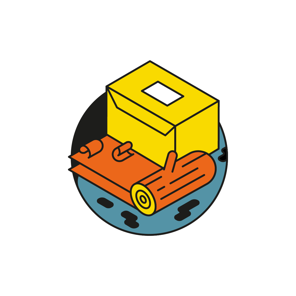 Illustrations about the steps that a product follows from the moment the raw materials are extracted until it appears in our house by sending the package.