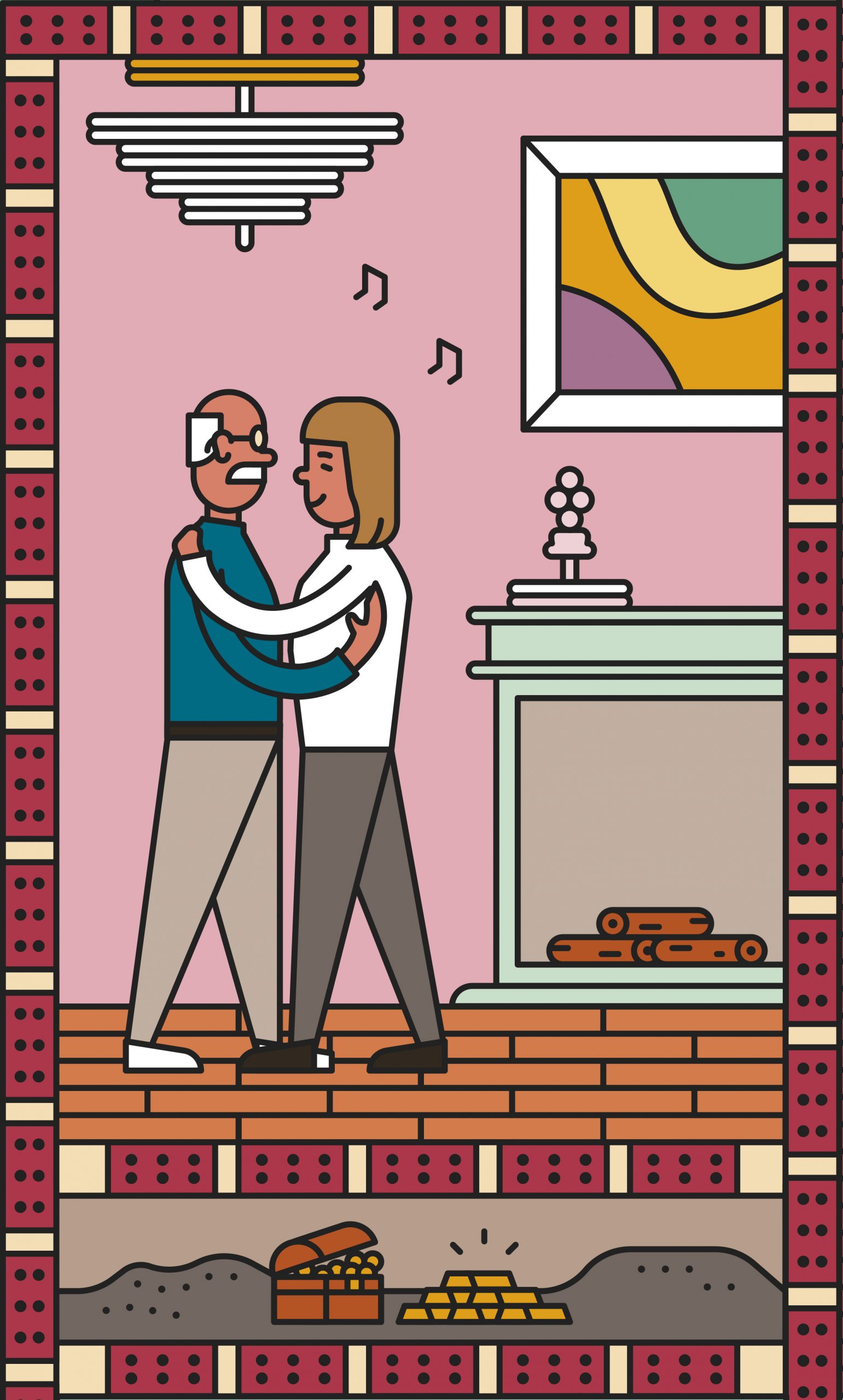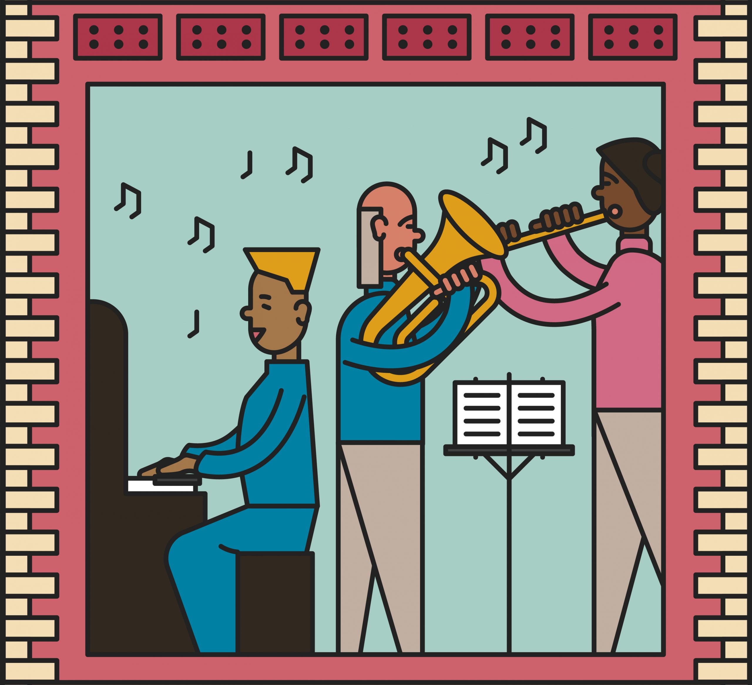 People dancing, playing games, creating music, cooking. A a cut in the section of an american building in which several illustrated actions appear framed in an american city.