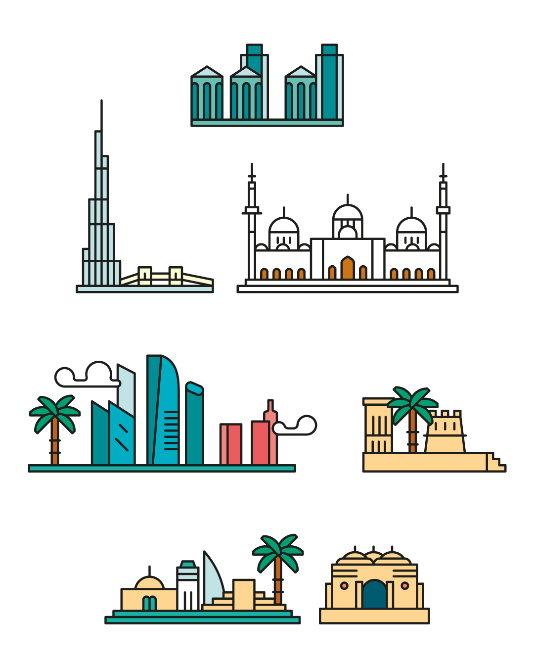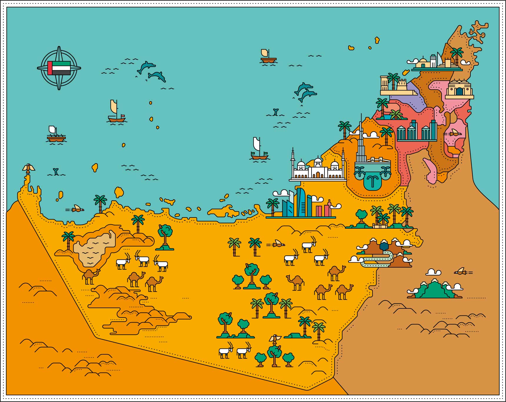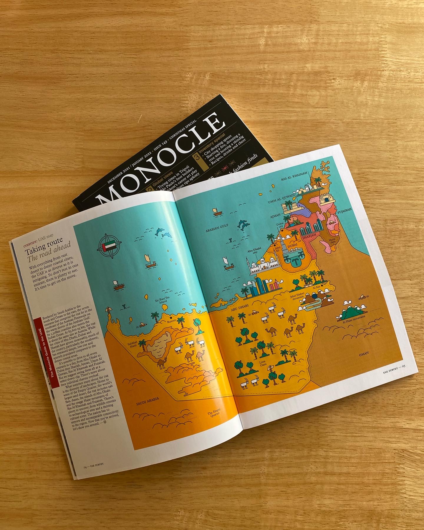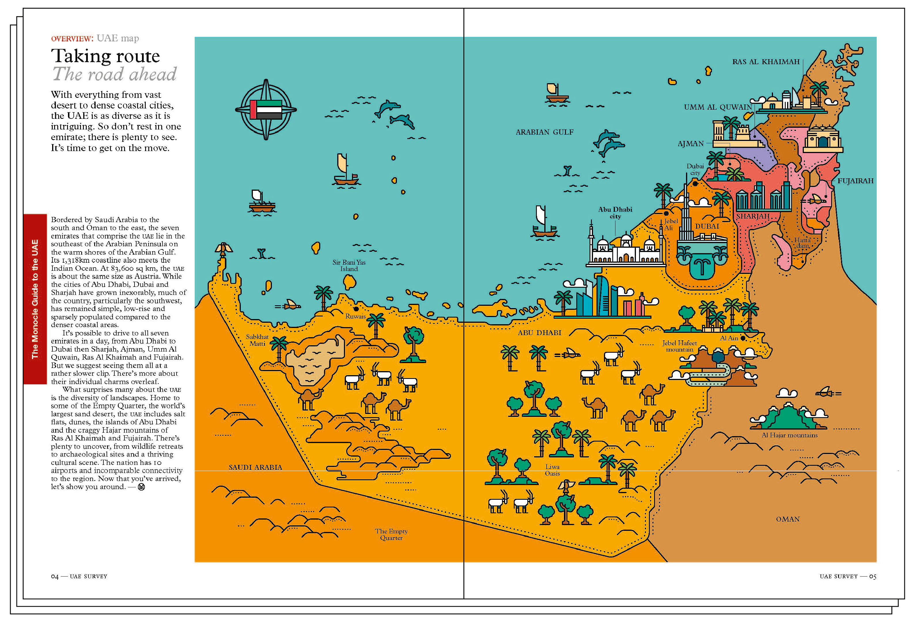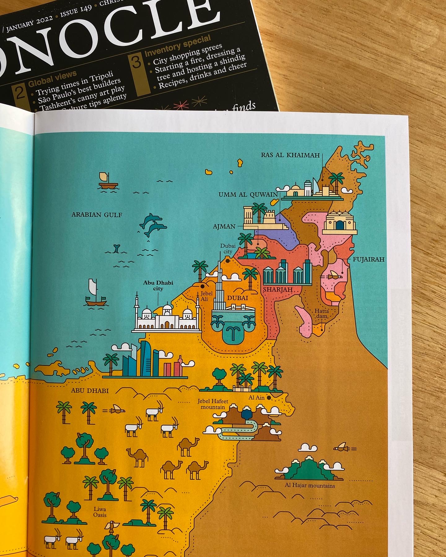 Infographic map for the Monocle 2021 United Arab Emirates guide. Issue December 2021- January 2022, Christmas special.