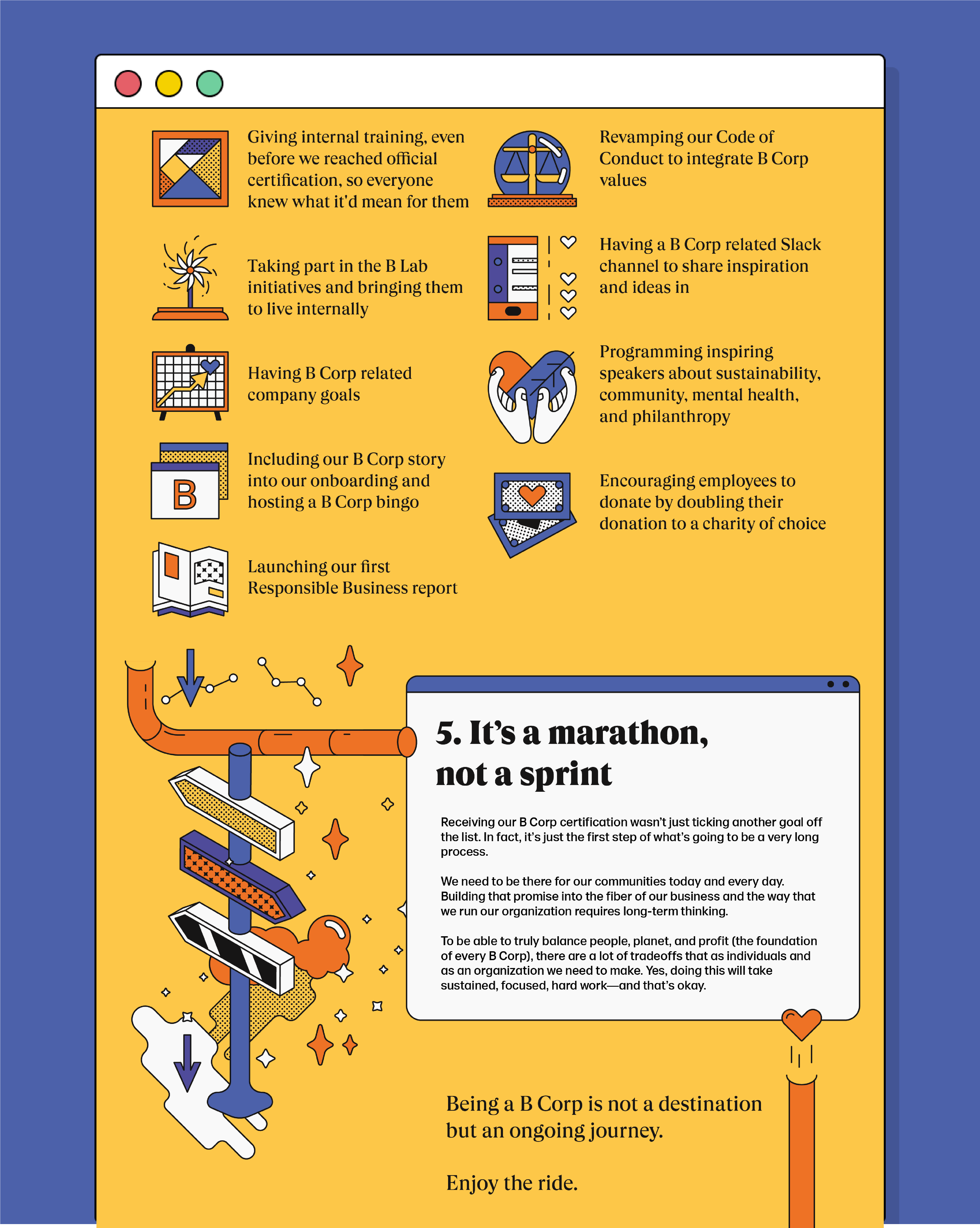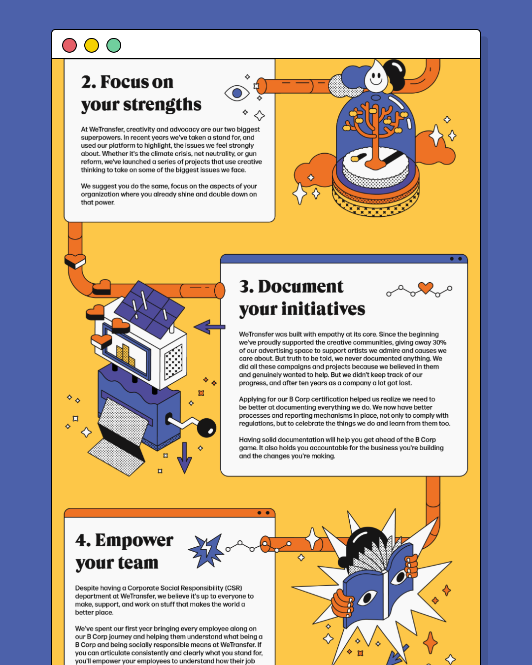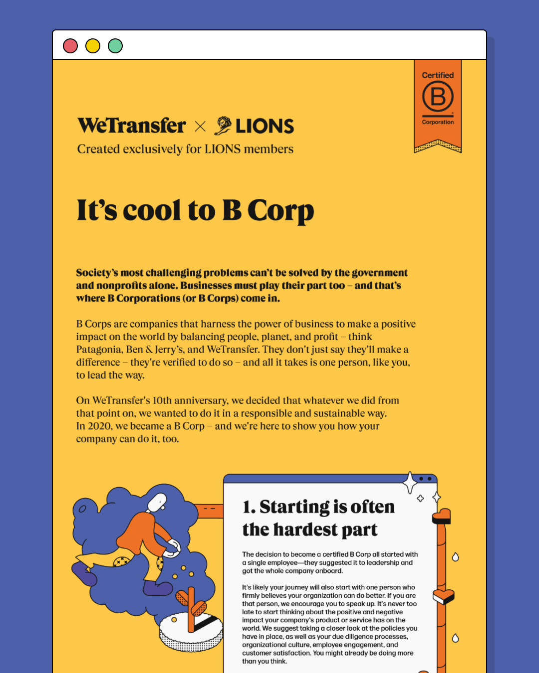 Illustrated guide to show some tips that WeTransfer has carried out as a B-Corp. Content created exclusively for Lions Cannes members.